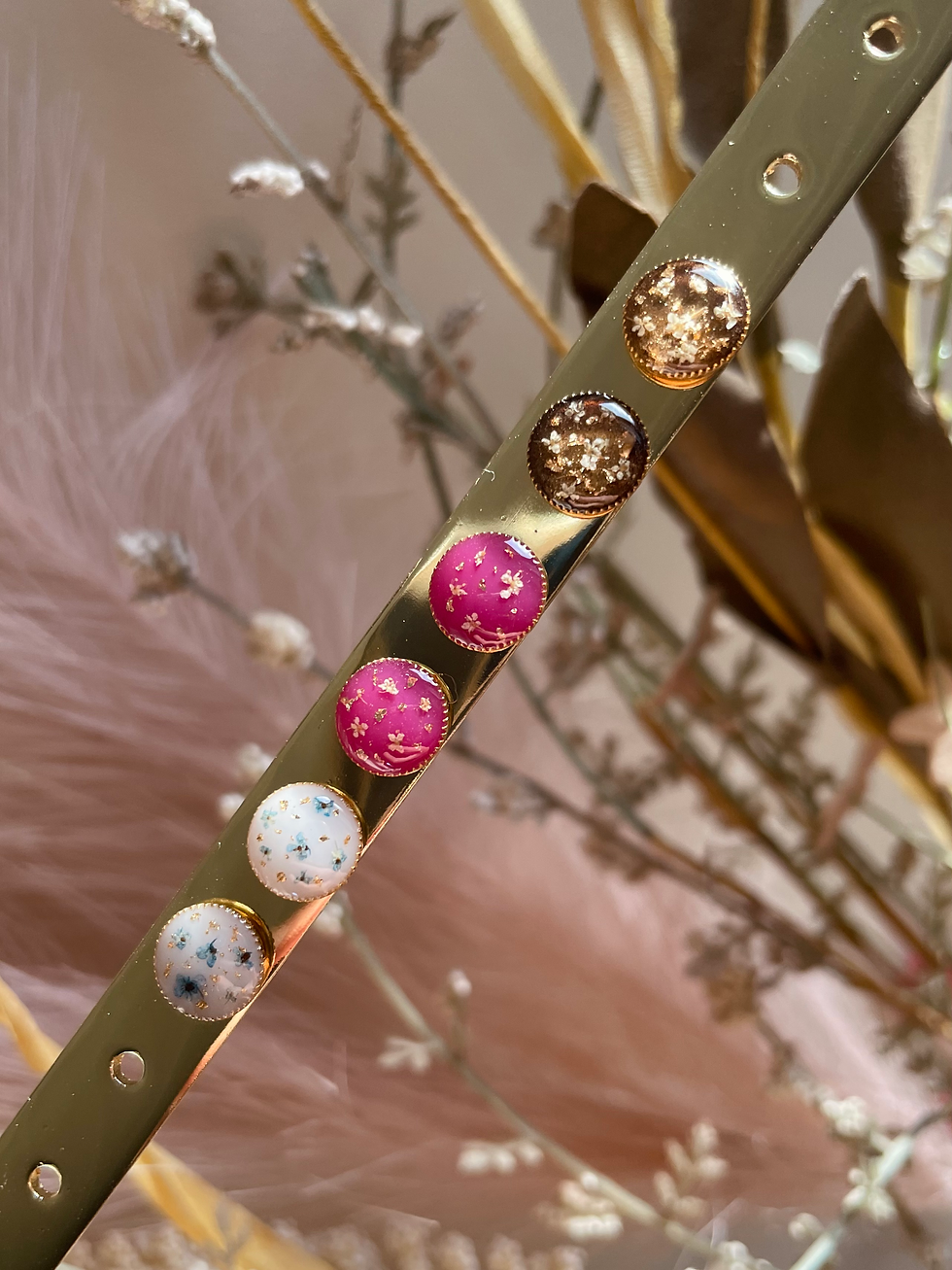 Boucles d’oreilles puces en résine époxy artisanale, montées sur acier inoxydable. Chaque paire est ornée de fleurs séchées naturelles, préparées à la main pour des bijoux délicats et uniques.